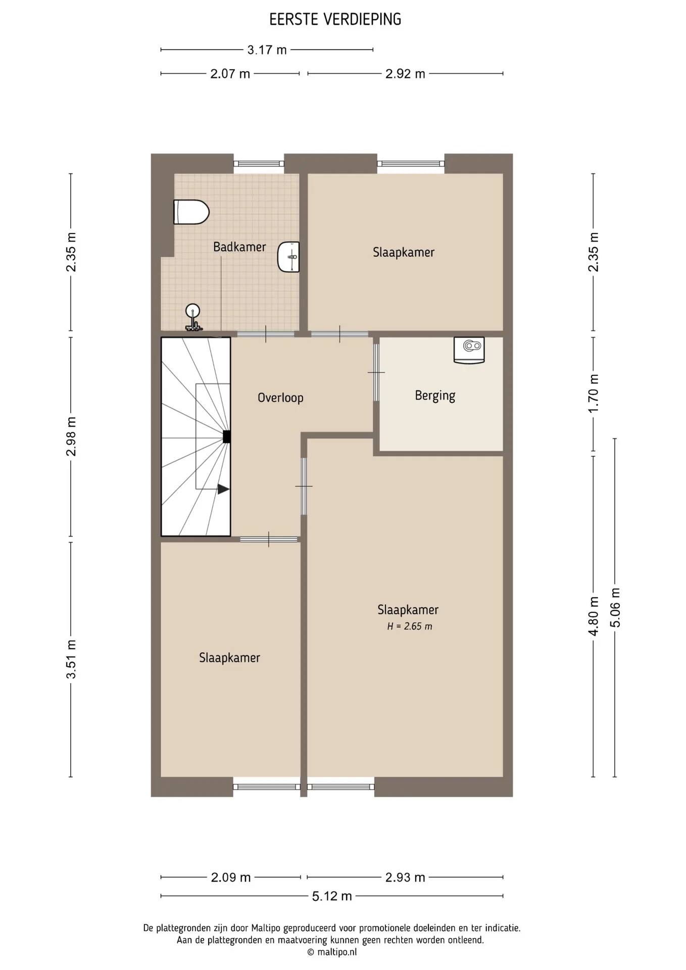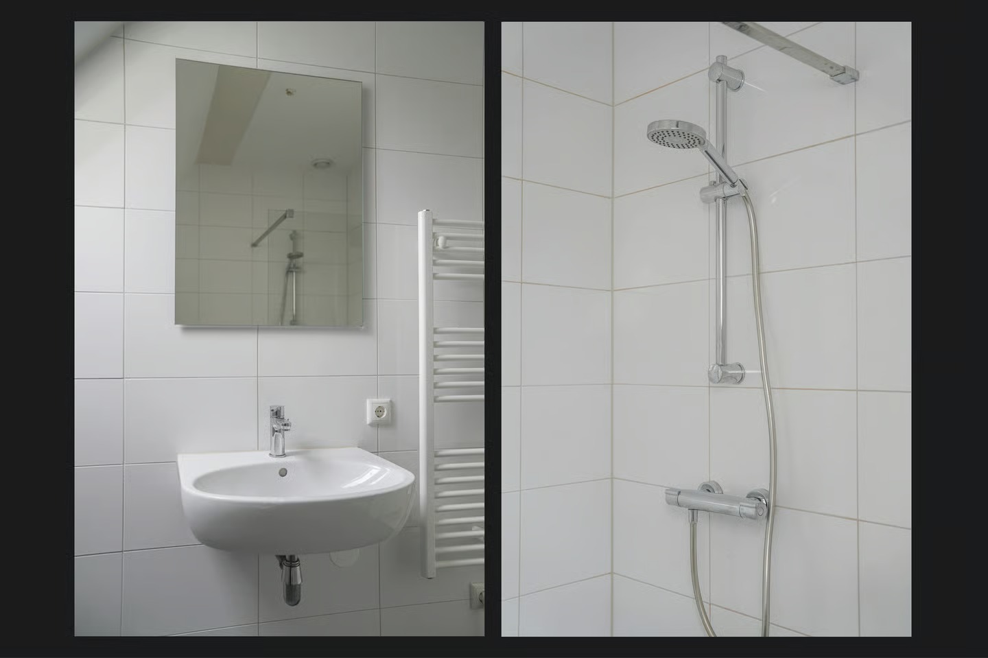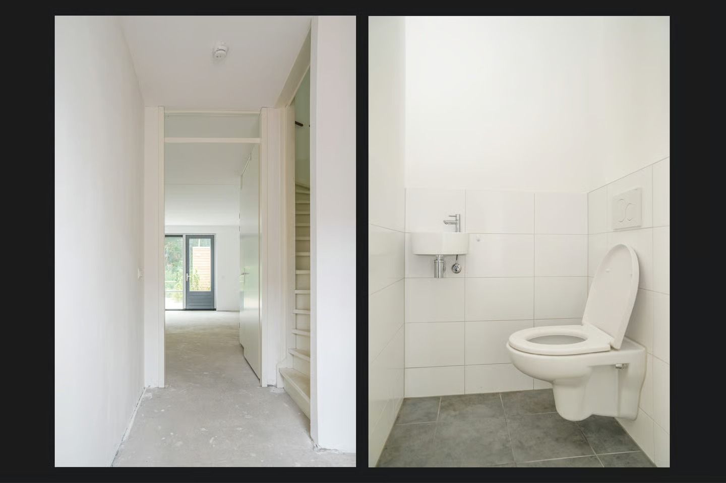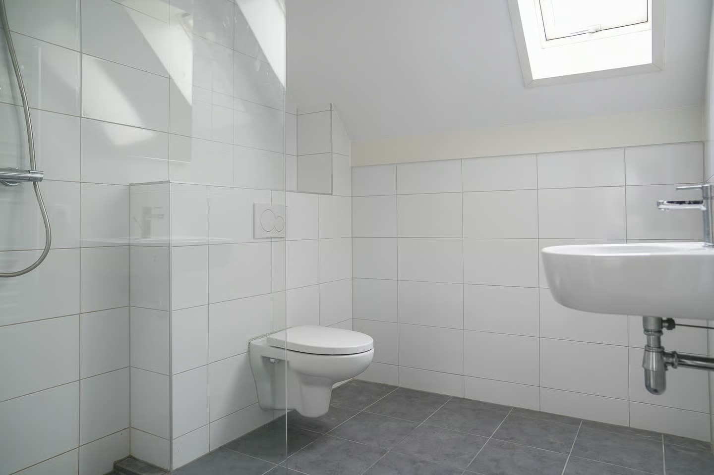 Op de eerste verdieping bevinden zich 3 slaapkamers en de badkamer met inloopdouche, toilet, wastafelmeubel, spiegel en een handdoekradiator. Daarnaast is er een aparte ruimte met de warmtepomp, boiler en aansluitingen voor de wasmachine en droger.