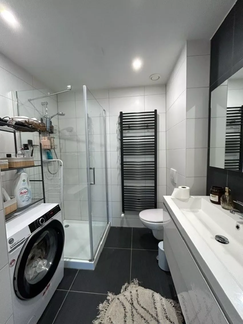 Het appartement beschikt over één aparte slaapkamer en is voorzien van een keuken met een 4 pits elektrisch koken, een koelkast met vriesvak, een combi-ovenmagnetron en een vaatwasser. De badkamer is voorzien van een douche, toilet, handdoekradiator, wastafelmeubel en een spiegel.