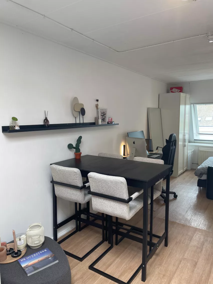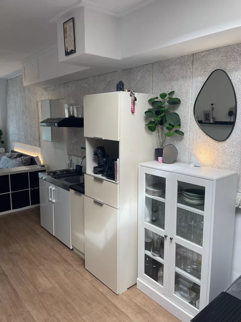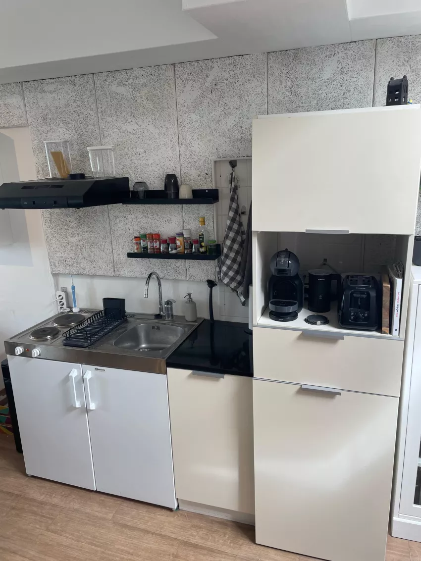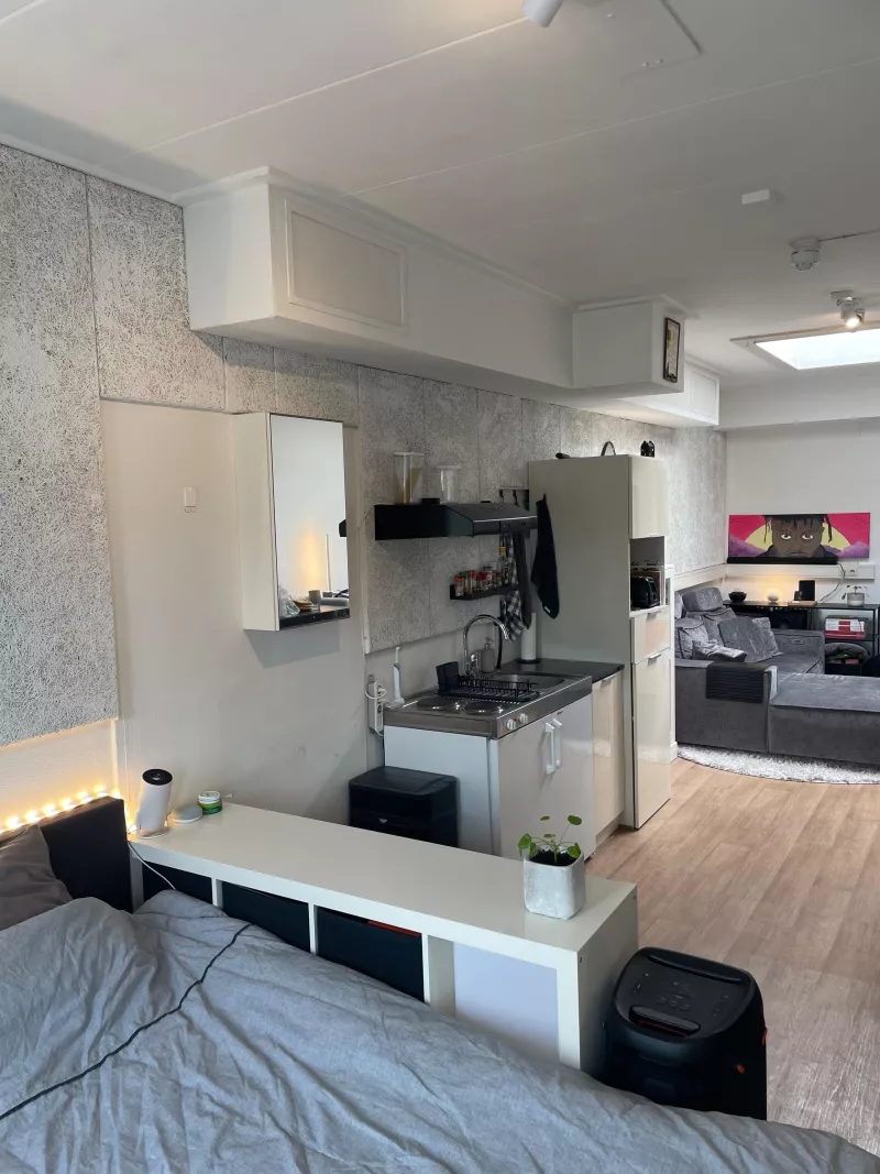 De kamer is voorzien van een eigen keuken met 2 pits elektrisch koken, een koelkast met vriesvak en afzuigkap. Daarnaast is er ook een eigen wastafel aanwezig. De toilet en douche is gedeeld met een gemiddelde van 4 anderen.