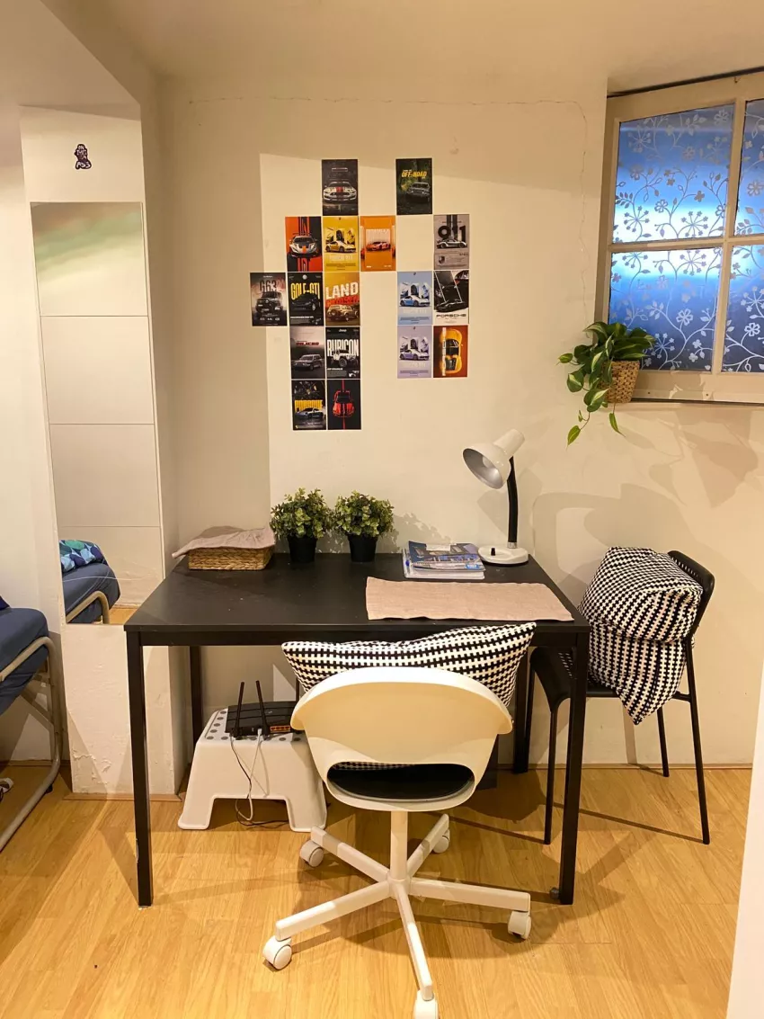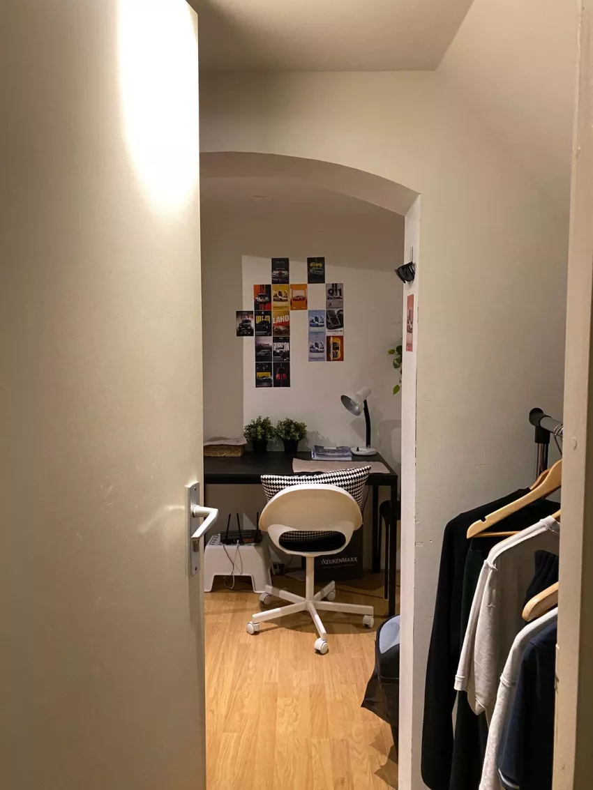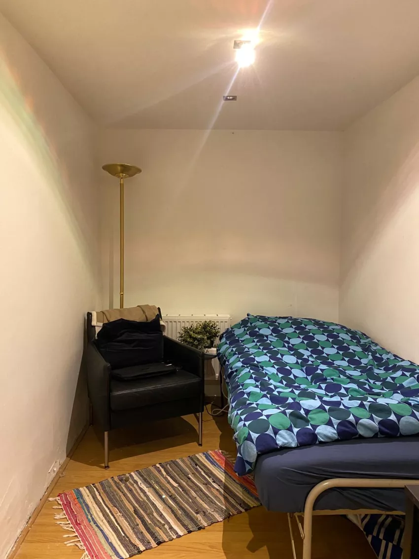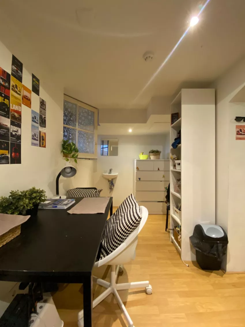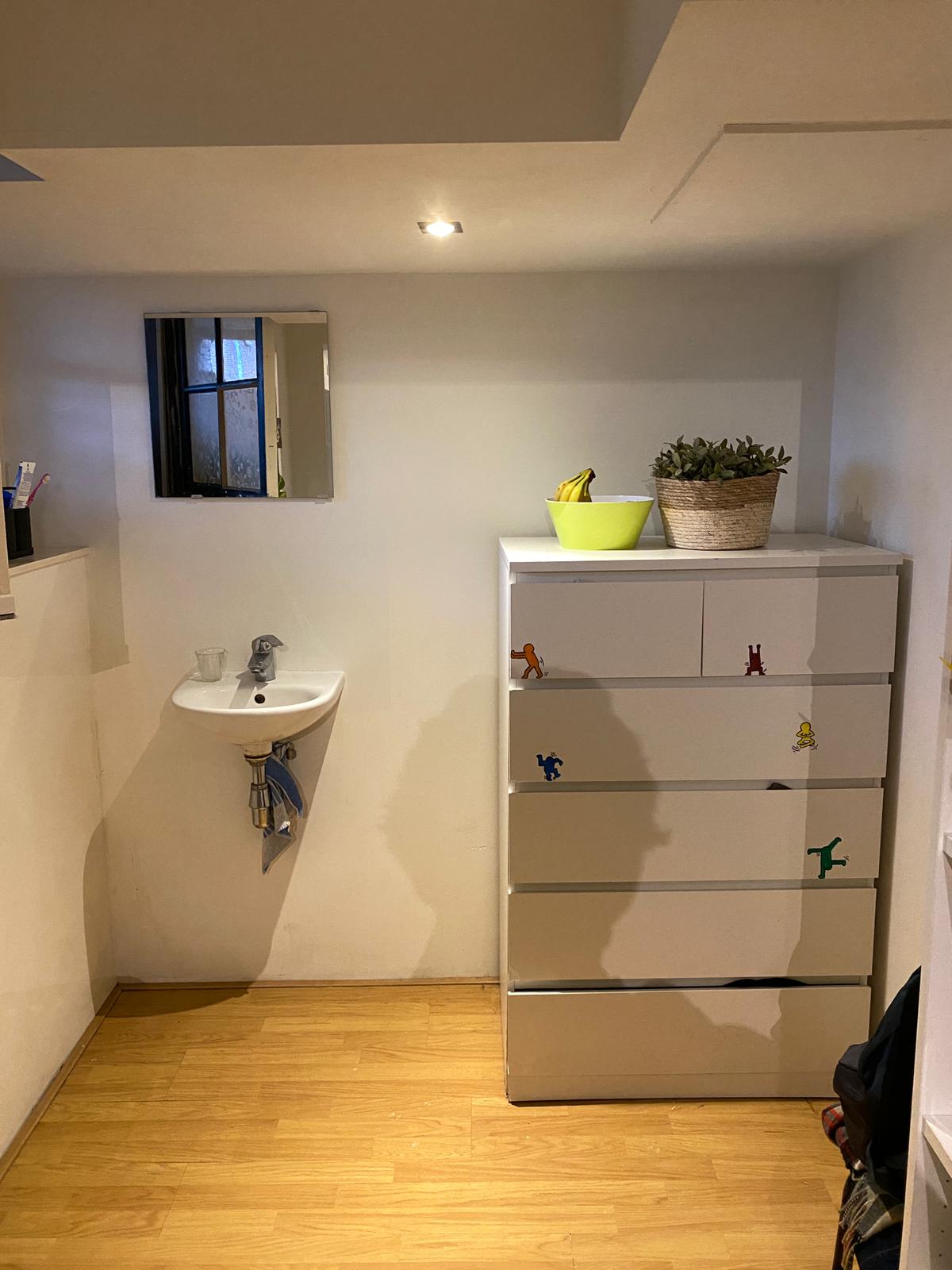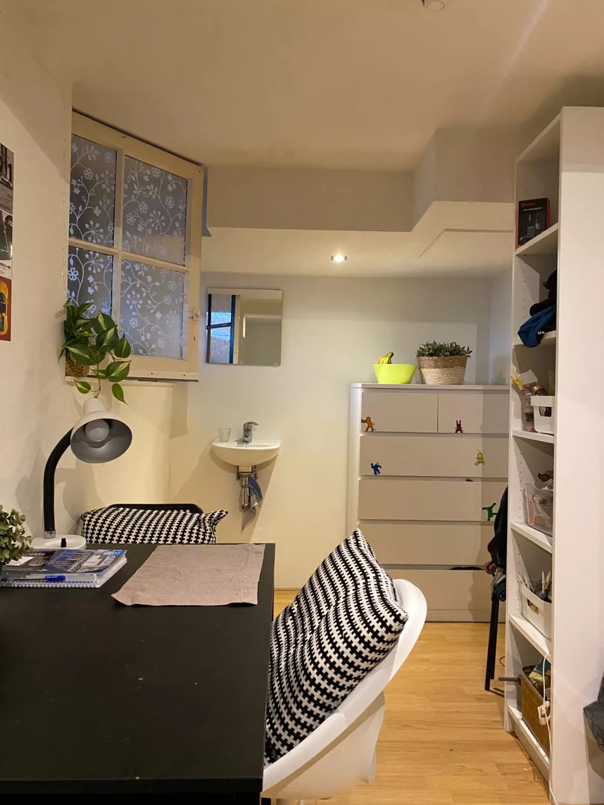 De kamer is gelegen in de souterrain en is voorzien van een eigen wastafel. De toilet en douche deel je met 3 andere bewoners.
