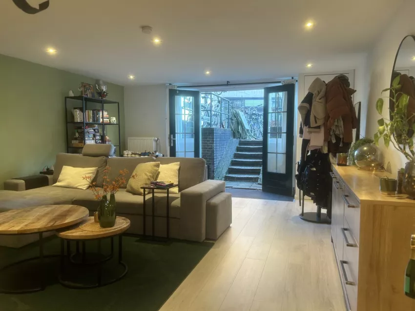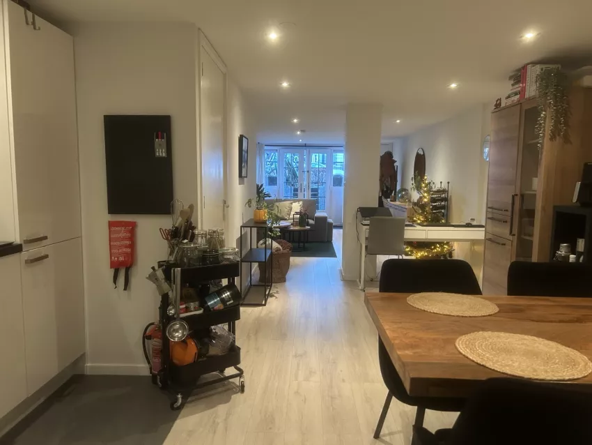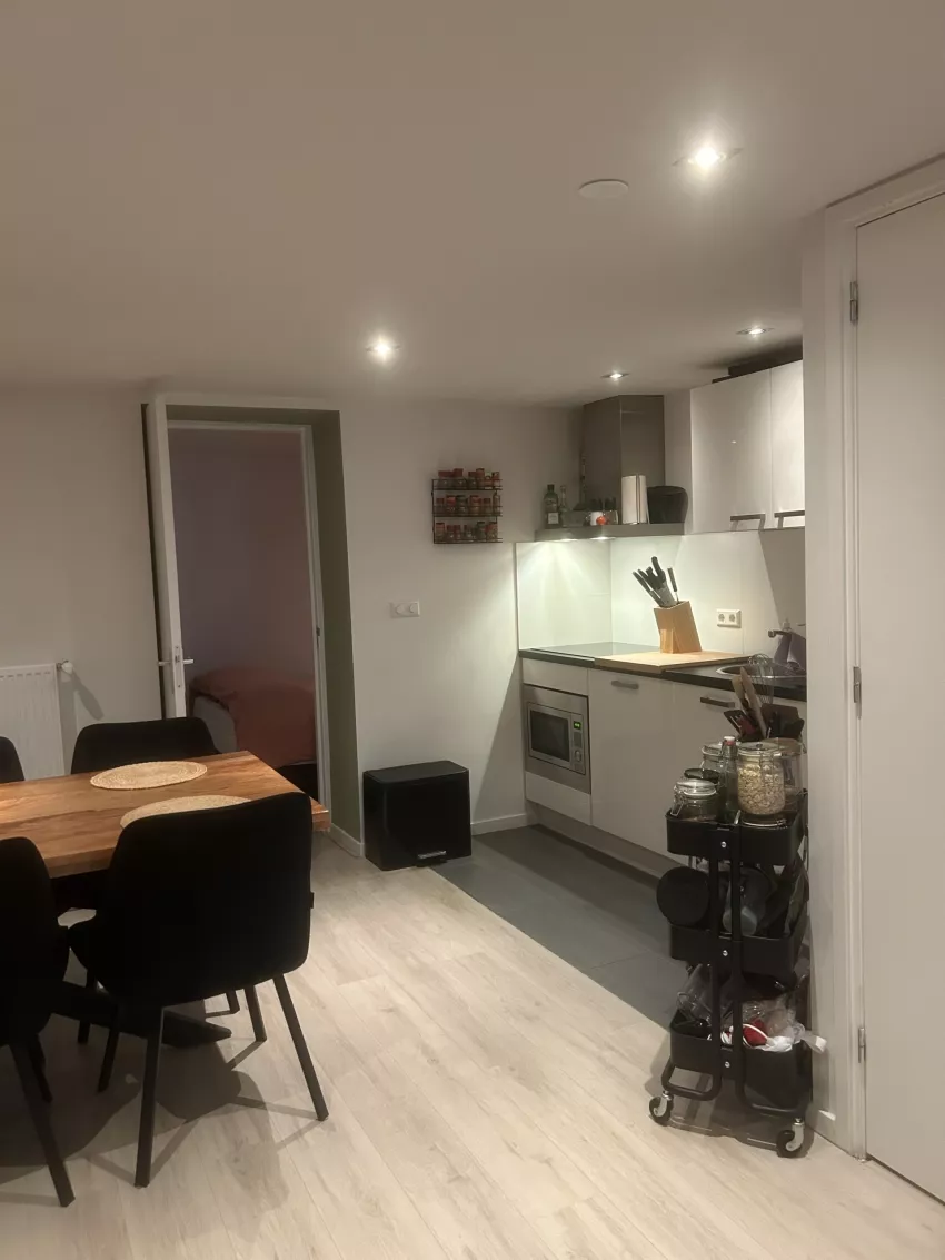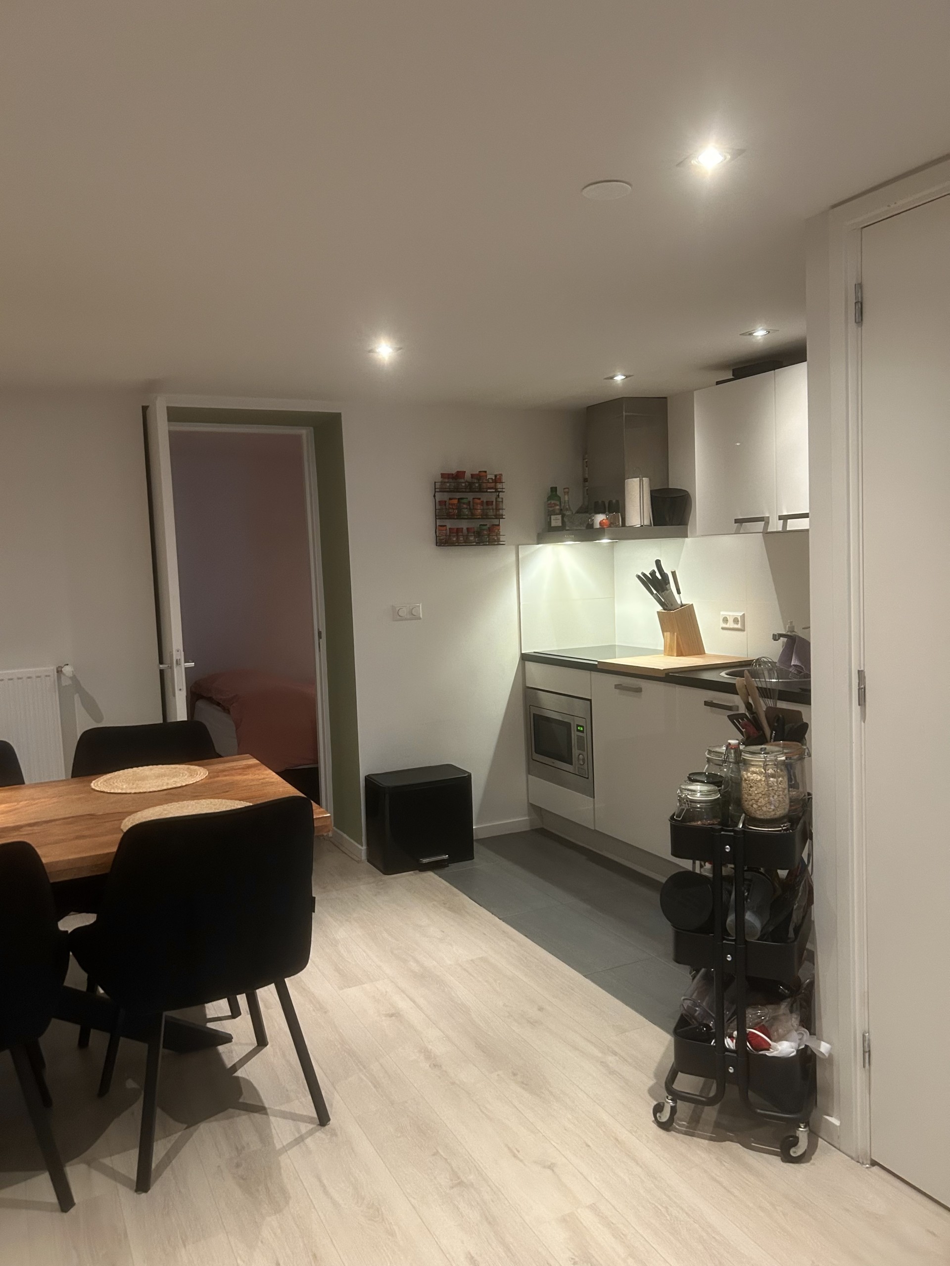 Het appartement is gelegen in de souterrain en beschikt over één aparte slaapkamers en een ruime woonkamer met open keuken. In de keuken bevinden zich een koelkast met vriesvak, 4-pits elektrisch koken en een afzuigkap. De badkamer is voorzien van een douche, toilet, wastafelmeubel, handdoekradiator en spiegel. In de badkamer is ook de aansluiting voor de wasmachine te vinden.