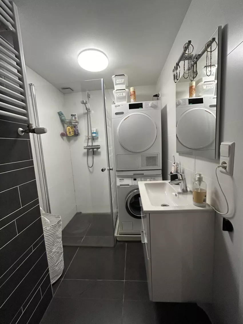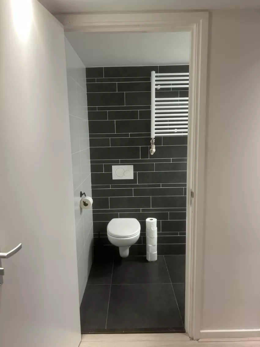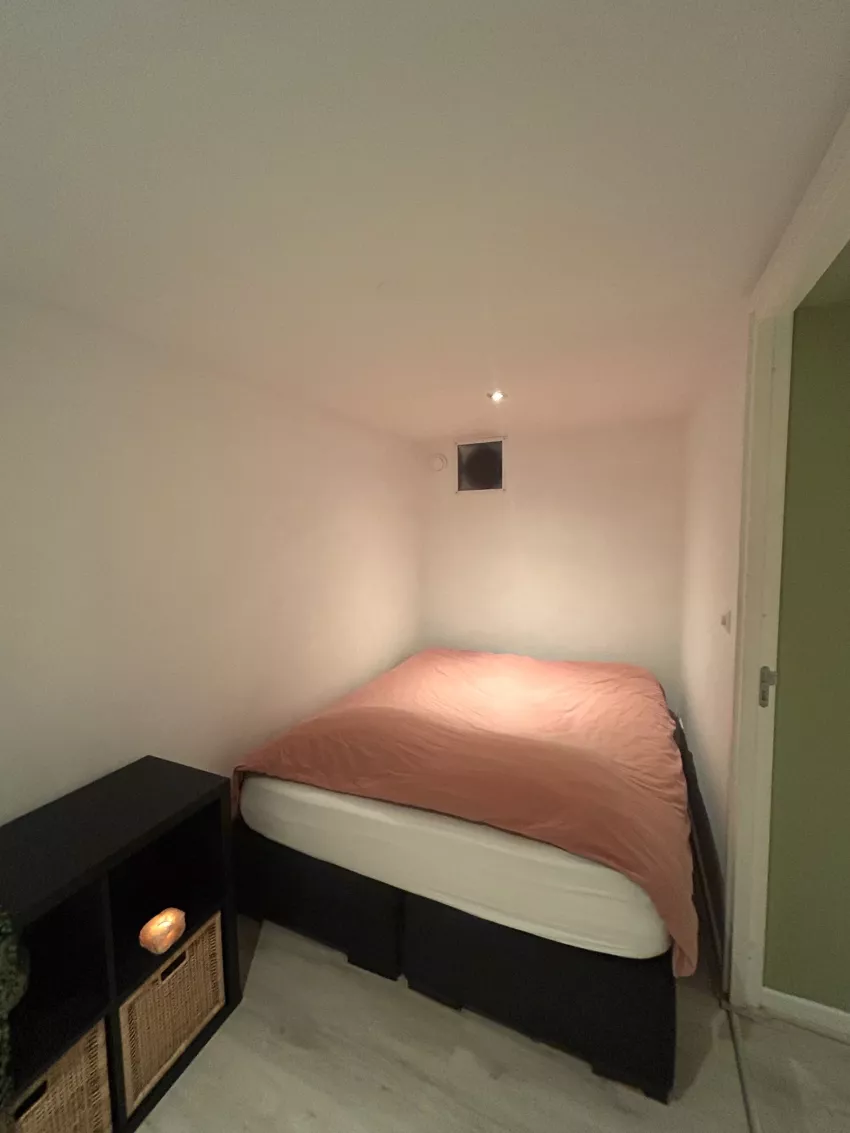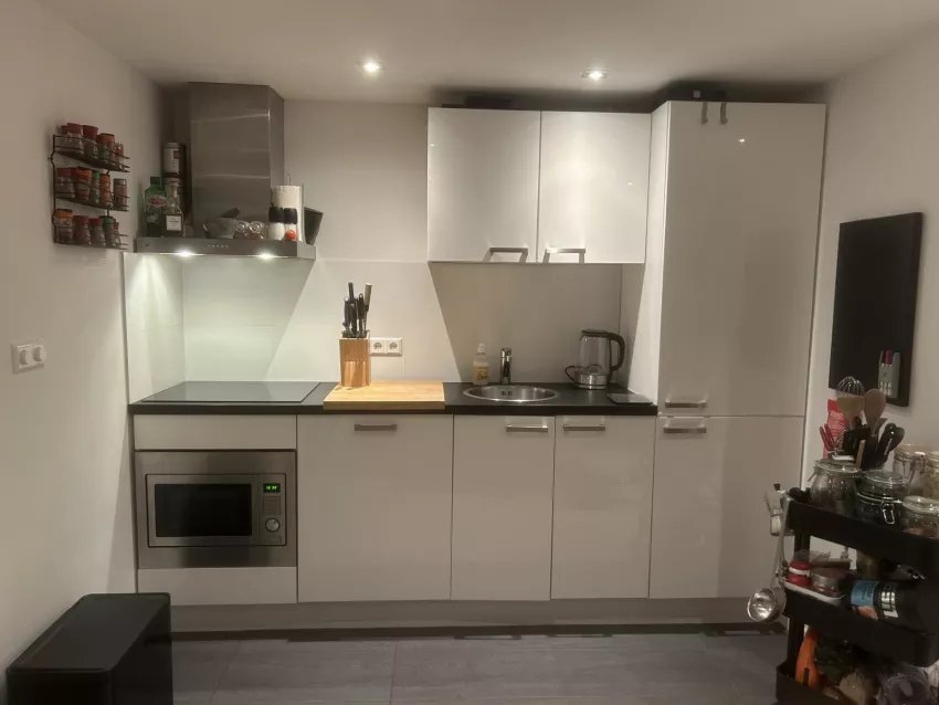 Het appartement is gelegen in de souterrain en beschikt over één aparte slaapkamers en een ruime woonkamer met open keuken. In de keuken bevinden zich een koelkast met vriesvak, 4-pits elektrisch koken en een afzuigkap. De badkamer is voorzien van een douche, toilet, wastafelmeubel, handdoekradiator en spiegel. In de badkamer is ook de aansluiting voor de wasmachine te vinden.