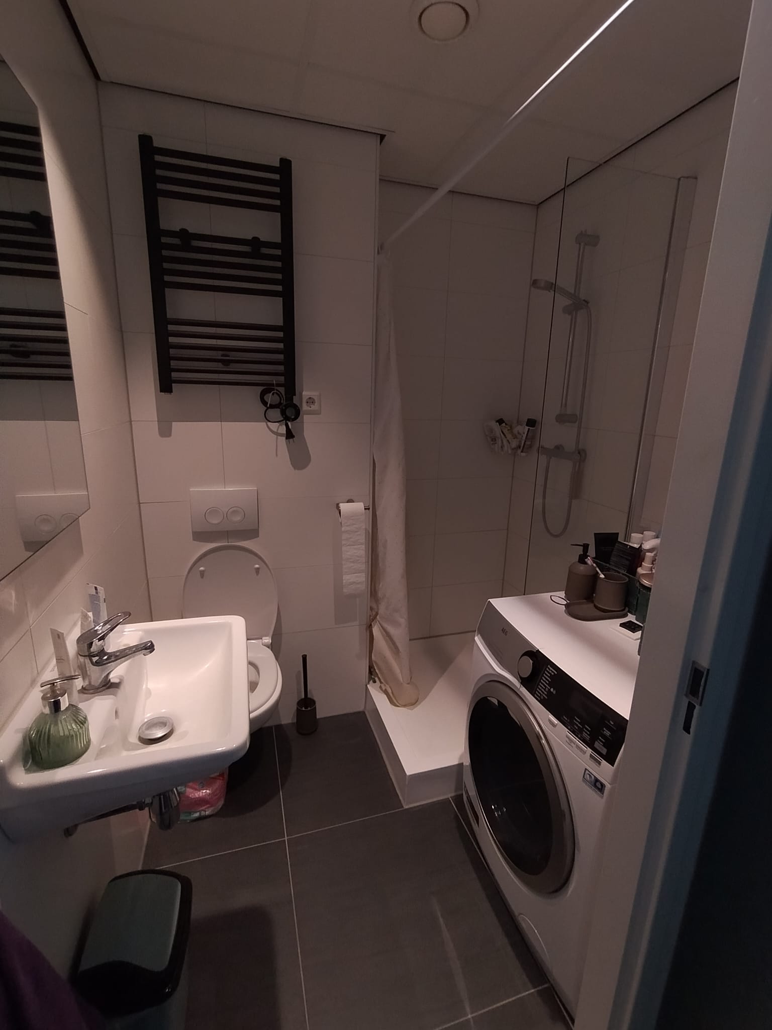 Het appartement is voorzien van een moderne keuken met een 4-pits elektrische kookplaat, koelkast, vriezer, combi-oven/magnetron en een vaatwasser. De badkamer is voorzien van een douche, toilet, handdoekradiator, wastafelmeubel en een spiegel. Op de badkamer is ook de aansluiting voor de wasmachine te vinden.