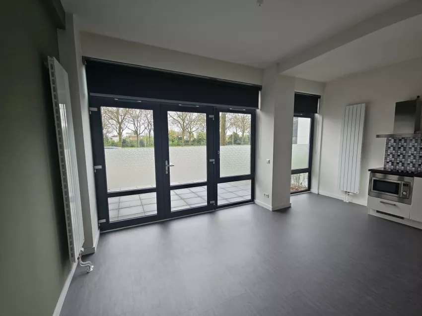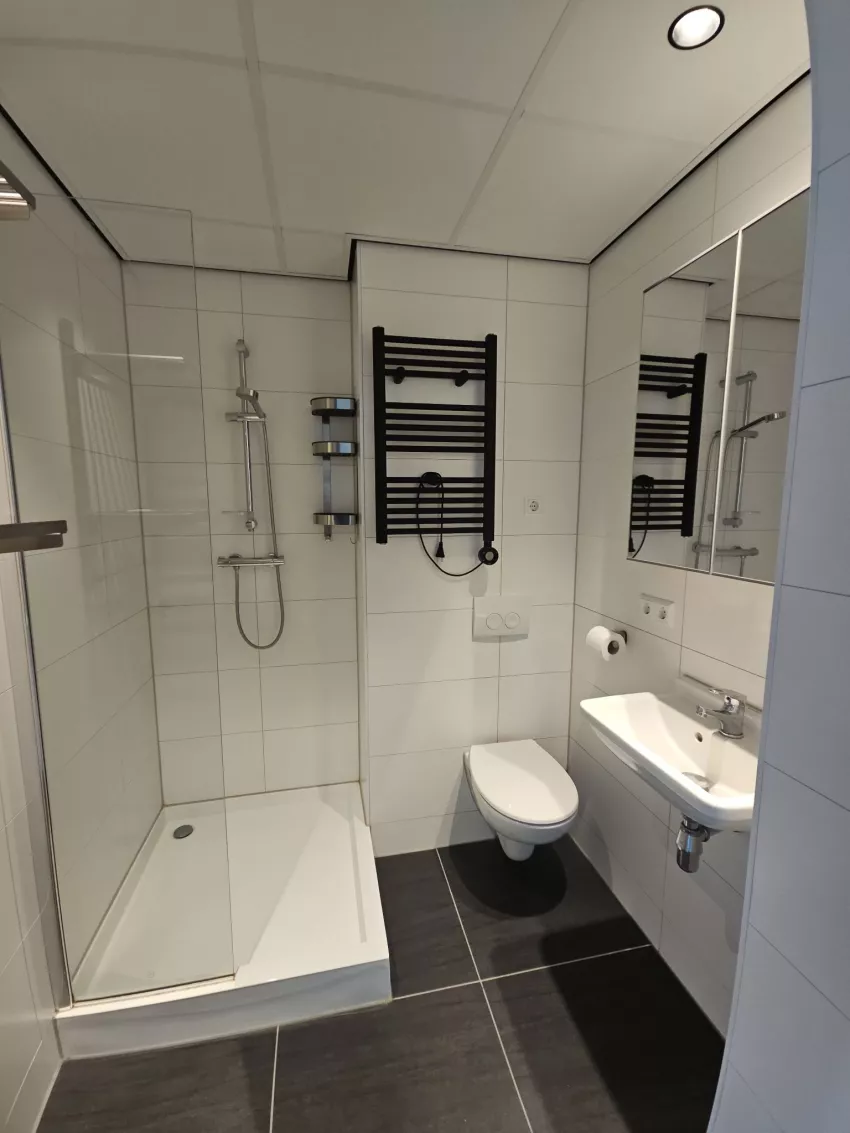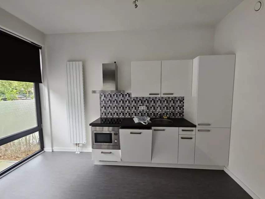 De studio is voorzien van een keuken met een 4 pits elektrisch koken, een koelkast, een vriezer, een combi-ovenmagnetron en een vaatwasser. De badkamer is voorzien van een douche, toilet, handdoekradiator, wastafelmeubel en een spiegel. Op de badkamer is ook de aansluiting voor de wasmachine te vinden. De volledige studio is daarnaast voorzien van een pvc-vloer en design rolgordijnen. De studio beschikt over een privé parkeerplaats rondom het pand inclusief privé berging in de kelder. Ten slotte heeft deze studio ook nog een privé terras.