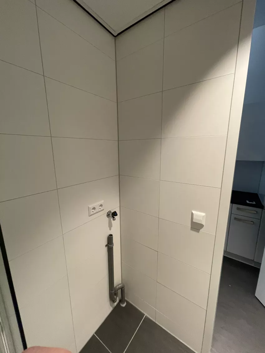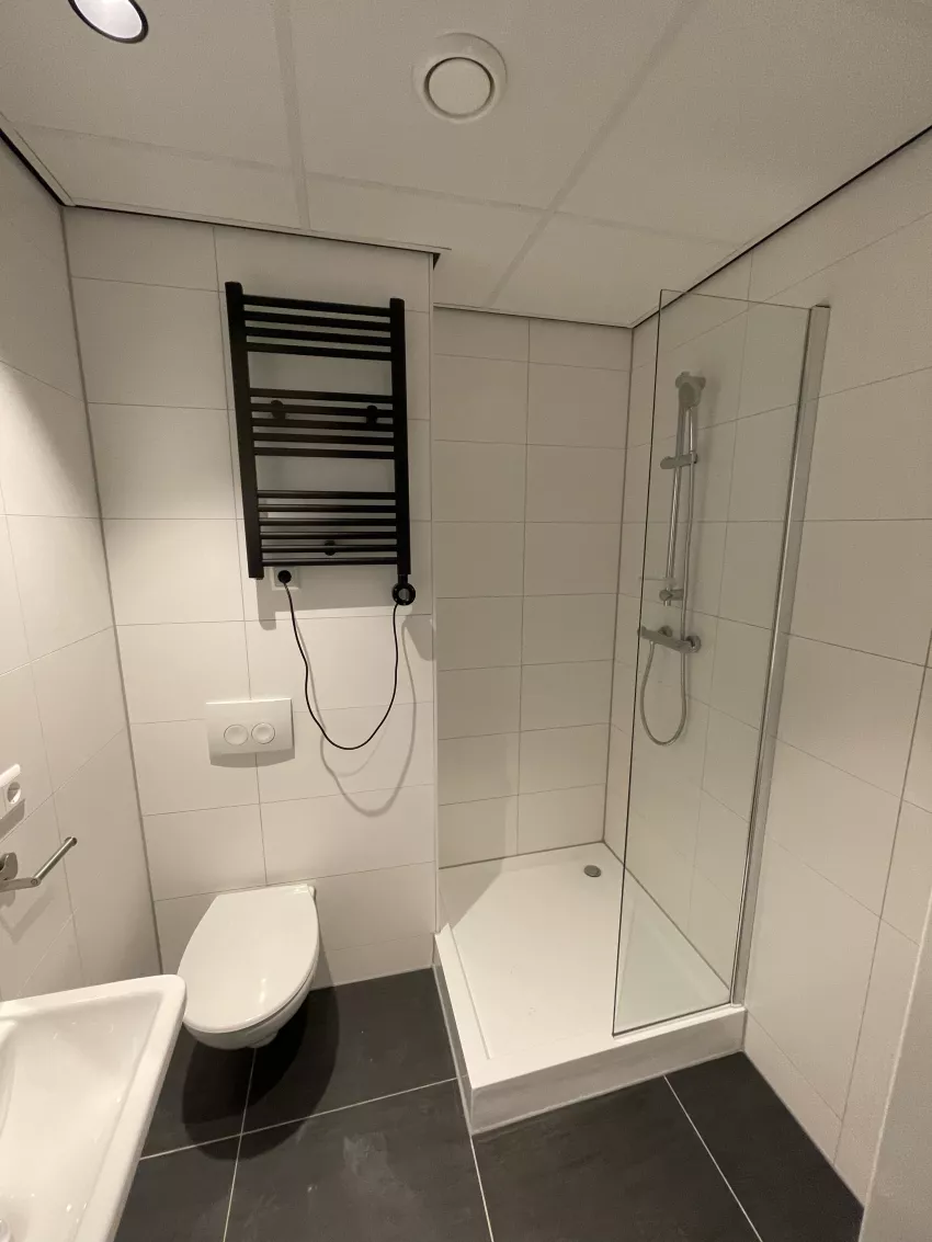 De studio bevindt zich op de begane grond en is voorzien van een keuken met een 4 pits elektrisch koken, een koelkast, een vriezer, een combi-ovenmagnetron en een vaatwasser. De badkamer is voorzien van een douche, toilet, handdoekradiator, wastafelmeubel en een spiegel. Op de badkamer is ook de aansluiting voor de wasmachine te vinden. De volledige studio is daarnaast voorzien van een pvc-vloer en design rolgordijnen. Het appartement beschikt over een privé parkeerplaats rondom het pand inclusief privé berging in de kelder.