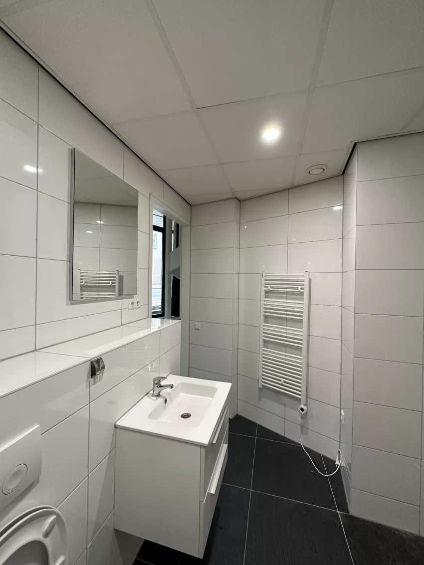 De woning is voorzien van een keuken met een 4 pits elektrisch koken, een koelkast, een vriezer, een combi-ovenmagnetron en een vaatwasser. De badkamer is voorzien van een douche, toilet, handdoekradiator, wastafelmeubel en een spiegel. Prachtig gezamenlijk dakterras aangekleed met meubilair!