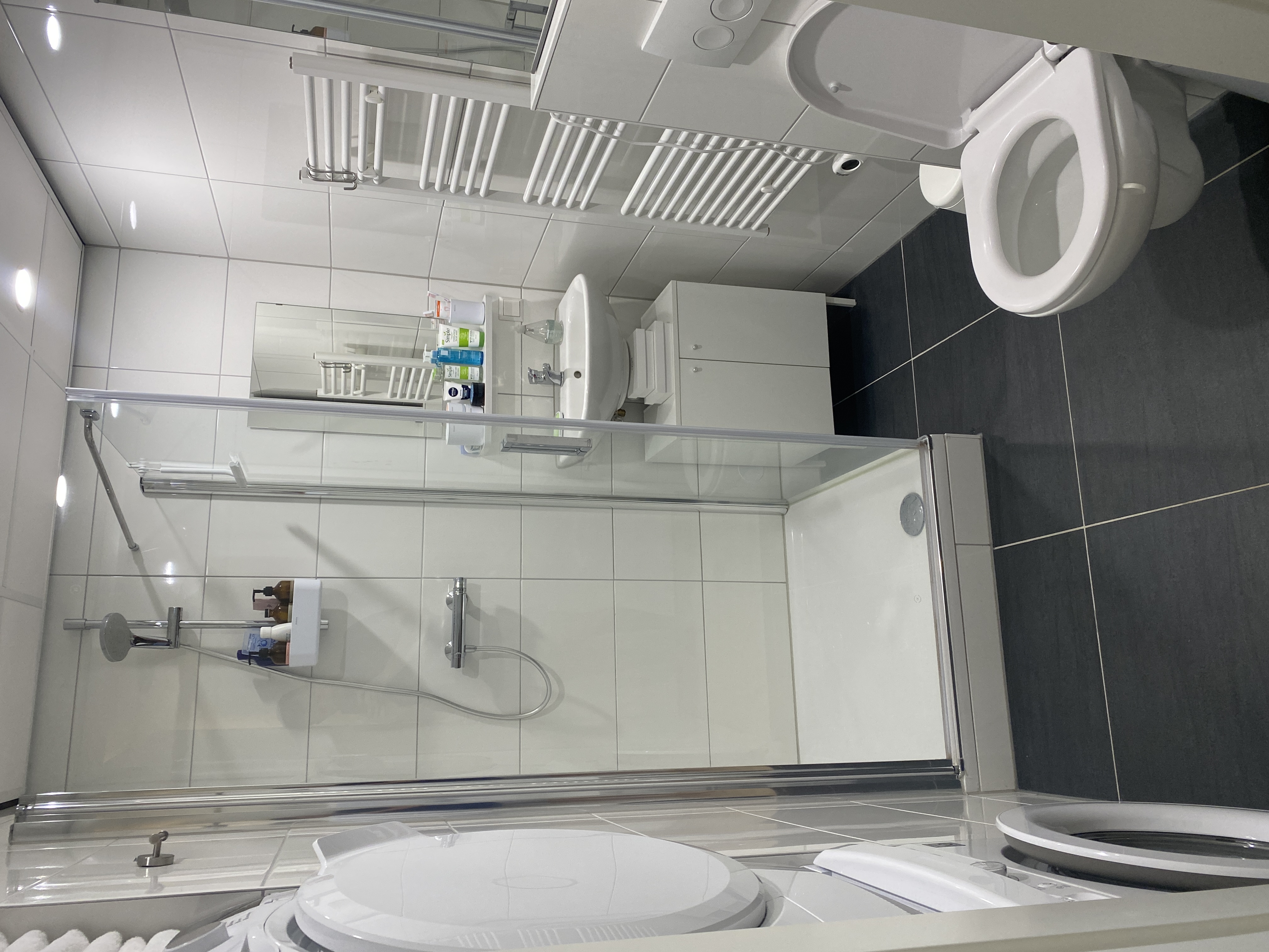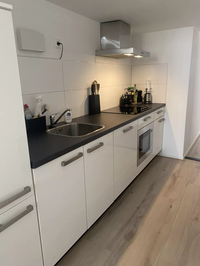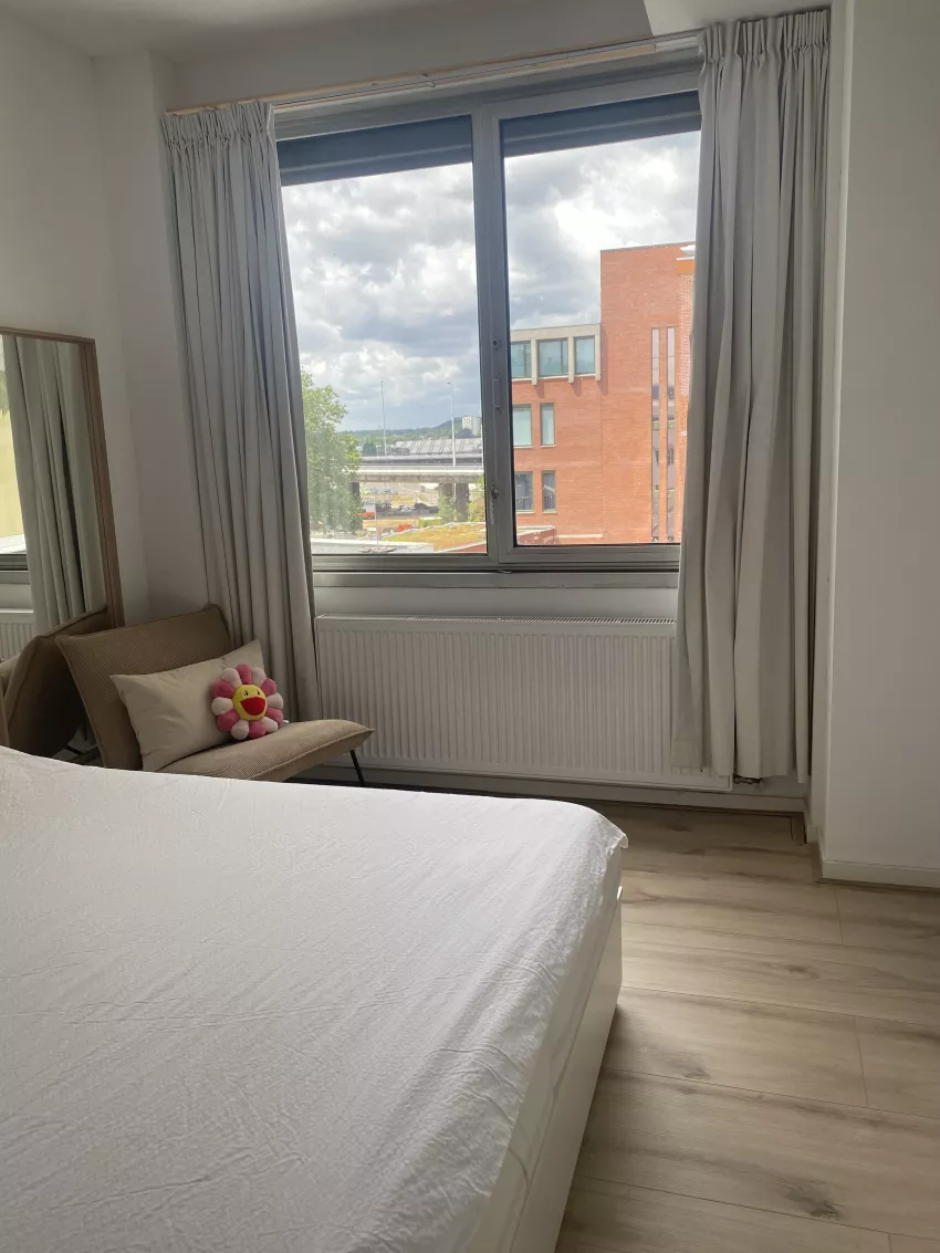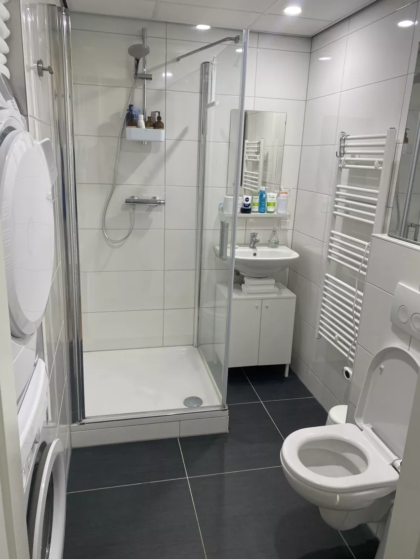 De woning is voorzien van een keuken met een 4 pits elektrisch koken, een koelkast, een vriezer, een combi-ovenmagnetron en een vaatwasser. De badkamer is voorzien van een douche, toilet, handdoekradiator, wastafelmeubel en een spiegel. Prachtig gezamenlijk dakterras aangekleed met meubilair!