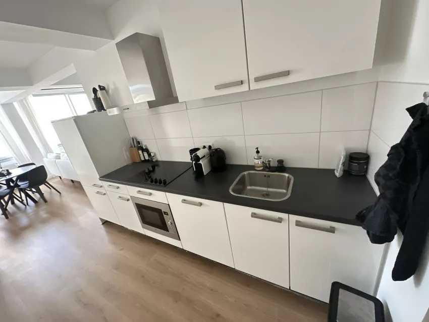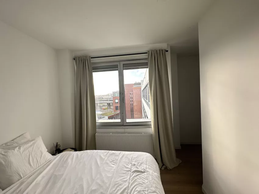 Het appartement is gelegen op de vijfde verdieping en beschikt over één aparte slaapkamer. Het appartement is voorzien van een keuken met een 4 pits elektrisch koken, een koelkast, een vriezer, een combi-ovenmagnetron en een vaatwasser. De badkamer is voorzien van een douche, toilet, handdoekradiator, wastafelmeubel en een spiegel. Op de badkamer is ook de aansluiting voor de wasmachine te vinden. Daarnaast is er een gezamenlijk dakterras aanwezig op de derde etage, aangekleed met meubilair.